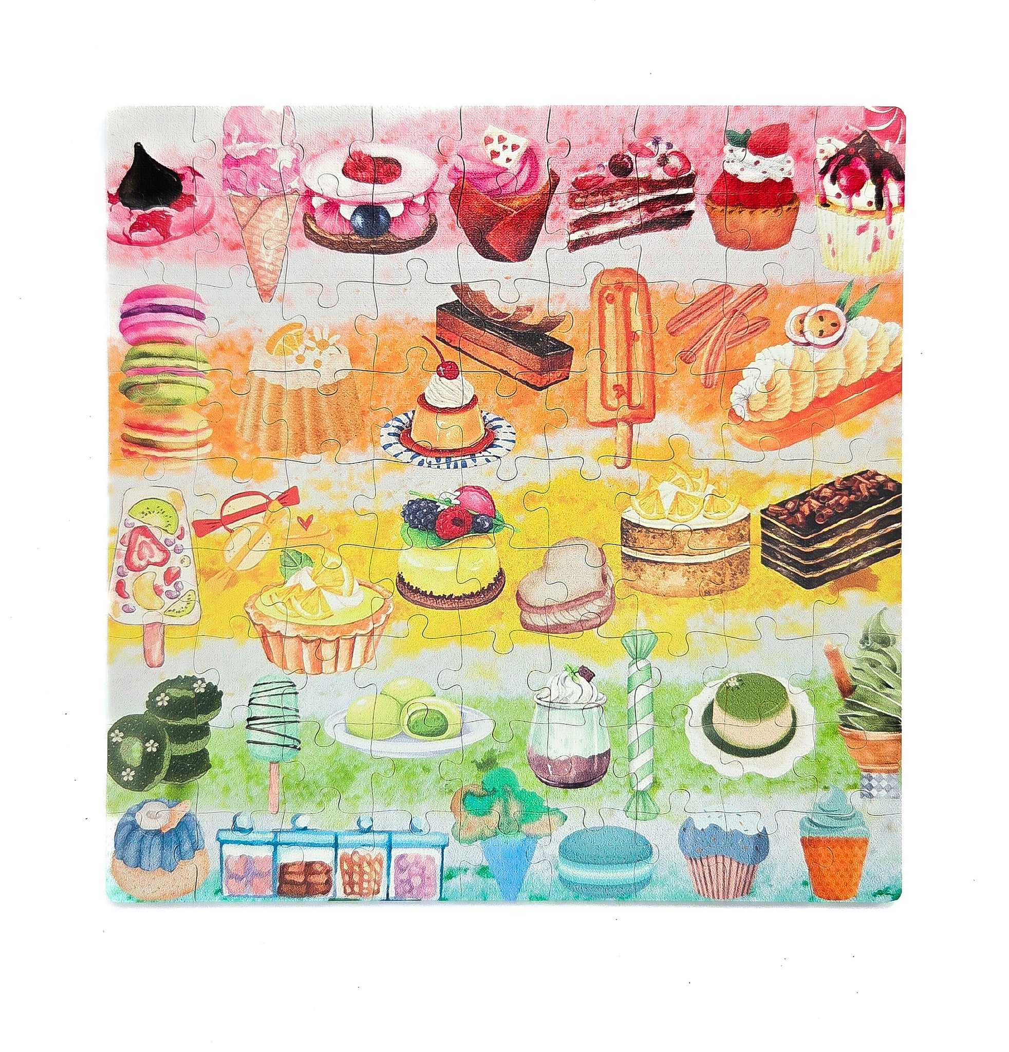 The Meredith's Delights Magnetic Puzzle contains a magnetic mat broken into three puzzle pieces. When assembled, the magnetic mat measures 8” x 16.”